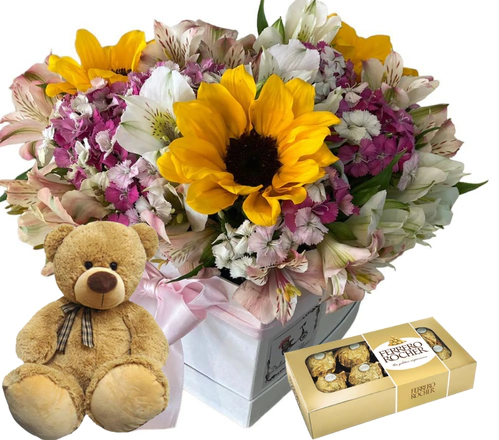 FLOWER BOX CORAZÓN DE FLORES DE ESTACIÓN + BOMBONES + OSITO